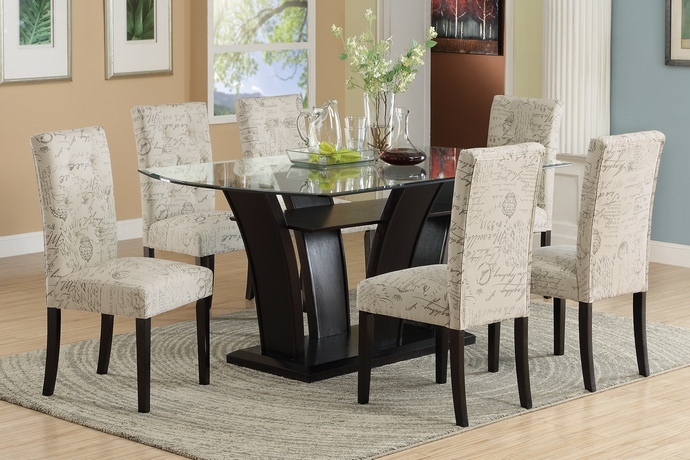 7 pc Harpers curve collection dark finish wood dining table set with curved base and tempered glass top. This set includes the table , 6 side chairs with french script microsuede upholstered. Table measures 72″ x 42″ x 30″ H. Side chairs measure 19″ x 21″ x 39″ H. Some assembly required.