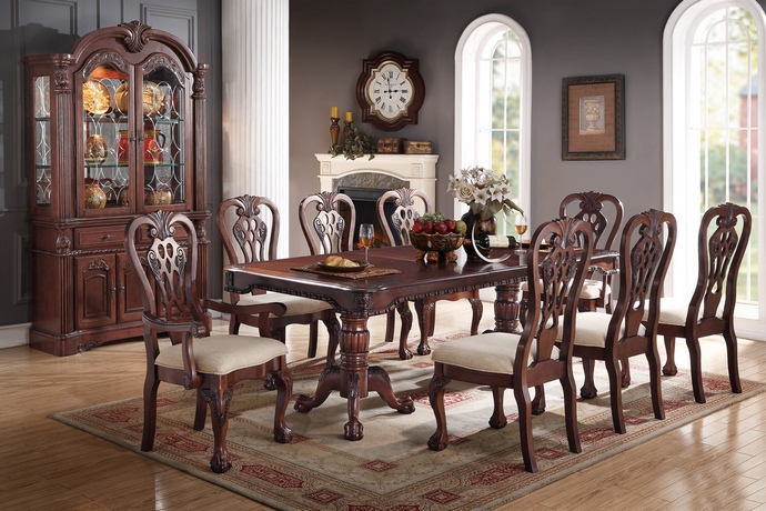 7 pc Harrison II collection cherry finish wood round dining table set with fabric seats. This set includes the table and 6 chairs with decorative backs , and fabric seats. Table measures 72″ (90″ with 1 – 18″ leaf) 42″ x 30″ H. Arm chairs measure 26″ x 23″ x 42″ H. Side chairs measure 21″ x 23″ x 42″ H to the back. Some assembly required.