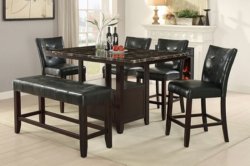 6 pc Arenth collection espresso finish wood counter height table with faux marble top dining table set. This set includes the table with faux marble top , counter height bench and 4 side chairs with black vinyl upholstery. Table measures 60″ x 40″ x 36″ H. Side chairs measure 19″ x 24″ x 40″ H. Bench measures 48″ x 16″ x 25″ H. Some assembly required.