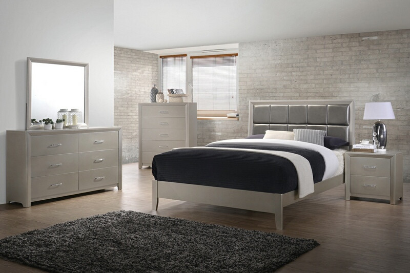 Source: F9399Q 5 pc Jasminia silver faux leather padded headboard silver finish wood queen bed set