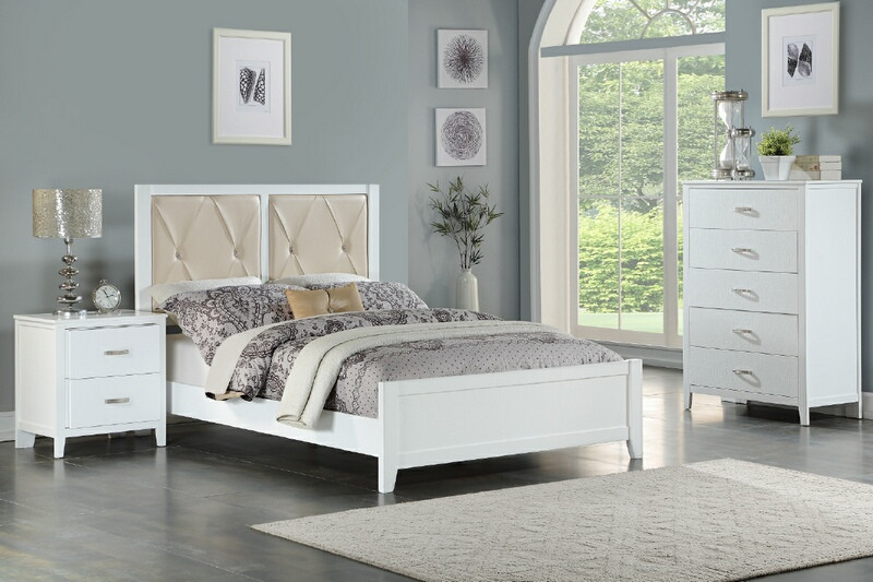 3 pc white finish wood upholstered panel bed full size bedroom set. This set includes the Full size Bed frame set, Nightstand, Chest. Bed measures 48″ H HB, 17″ H FB. Nightstand measures 22″ x 16″ x 24″ H. Chest measures 32″ x 17″ x 48″ H. Also available in Twin size. Some assembly required.