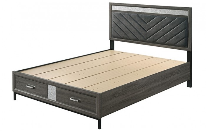 FM7212GY-4PC 4 pc Voleta grey finish wood crystal like accents fabric padded queen bedroom set foot board drawers. This set includes the Bed, Nightstand, Dresser, Mirror. Bed measures 63″ x 84″ x 51″ H. Nightstand measures 23″ x 15″ x 25″ H. Dresser measures 58″ x 18″ x 38.5″ H. Mirror measures 39″ x 1″ x 35″ H. Chest available separately at additional cost and measures 30.5″ x 18″ x 46.5″ H. Also available in Eastern king. Some assembly required.