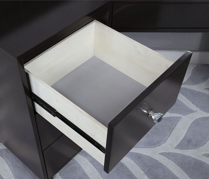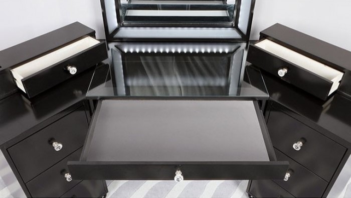 3 pc Rosdorf park sheffield tracie obsidian gray finish wood corner make up bedroom vanity set. This set includes the corner vanity with clear glass center top , stool and mirror with LED lighting. Vanity measures 74 3/8″ x 31 7/8″ x 30″ H. Mirror measures 30 1/2″ x 30 1/2″ H x 1 5/8″ D. Stool measures 19 1/2″ x 14 3/4″ x 16 7/8″ H. Also comes in luminous white and tiffany blush color as well. Some assembly required.