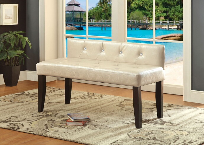Galen III collection pearl white crocodile leatherette crystal button tufted seat and dark wood legs bedroom bench . Measures 42″ x 19″ x 26″ H . Some assembly required.