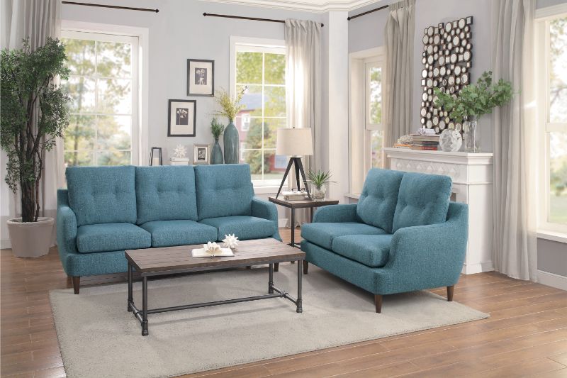 2 pc Cagle blue fabric sofa and love seat set with tufted back. This set includes the Sofa and Love seat with tufted back . Sofa measures 78.5″ x 34.5″ x 38″ H. Love seat measures 54″ x 34.5″ x 38″ H. Optional accent chair also available separately at additional cost and measures 32.5″ x 34.5″ x 38″ H. Some assembly required.