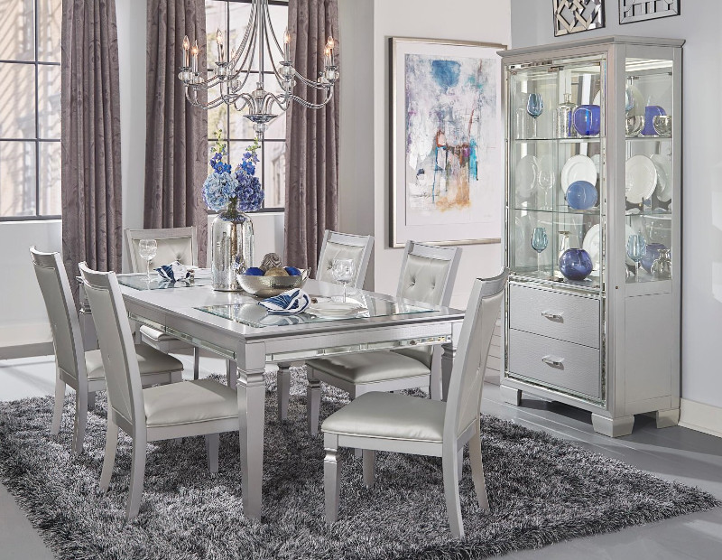 Source: Home Elegance 1916-84 7 pc Allura silver finish wood dining table set with glass inserts