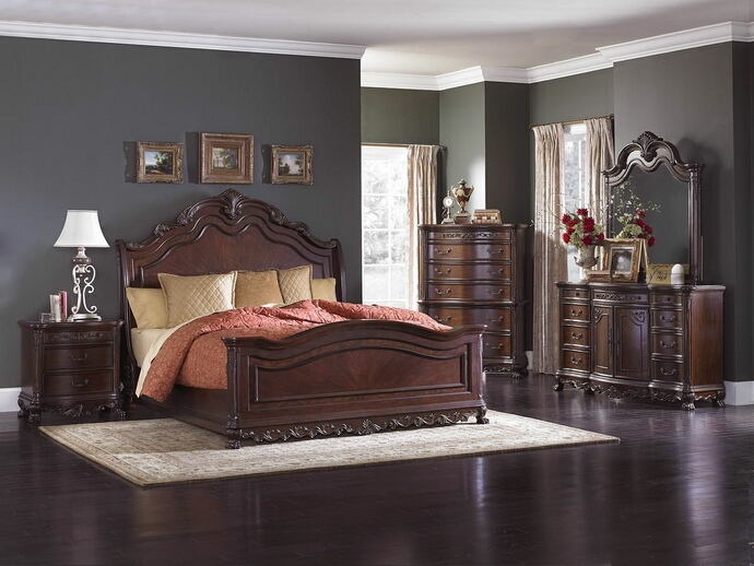 5 pc Deryn Park II collection cherry finish wood carved accents bedroom set. This set includes the Bed, Nightstand, Dresser, Mirror and Chest. Bed measures 70″ H HB 31″ H FB. Nightstand measures 30″ x 18″ x 29″ H. Dresser measures 68″ x 19″ x 39″ H. Mirror measures 49″ x 5″ x 49″ H. Chest measures 42″ x 19″ x 59″ H. Also available in Cal king and Eastern King. Some assembly required.