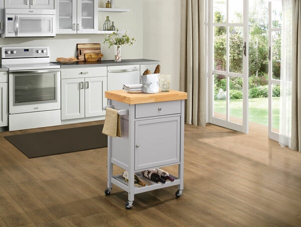 Source: Home Elegance 4698GY-07 Kady collection two tone grey and natural finish wood kitchen island cabinet with casters