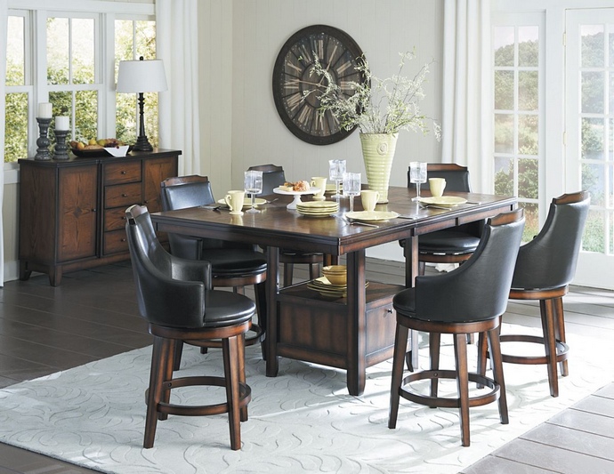 7 pc bayshore burnished walnut finish wood counter height pedestal dining table set. This set includes the table with one leaf and 6 – side chairs with vinyl padded seats and backs. Table measures 47.5x 53.5″ (71.25″ with 1 – 18″ leaf) x 36″ H. Side chairs measure 20.75″ x 23″ x 41.25″ H. Additional chairs and Buffet also available separately. Some assembly required.