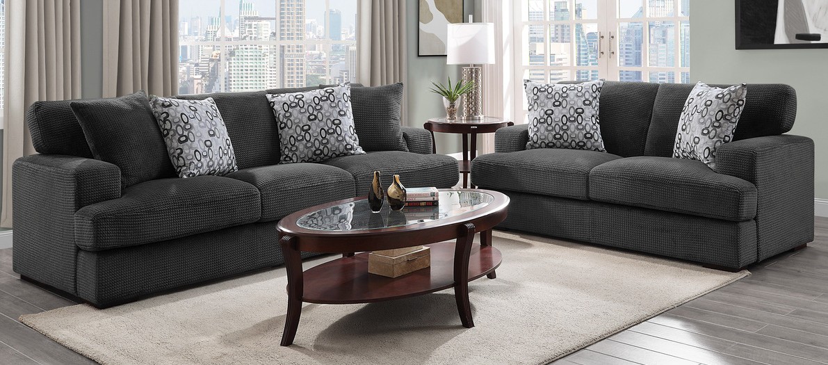 Source: Homelegance 9318CBN-SL 2 pc Rivermeade carbon textured plush microfiber sofa and love seat set