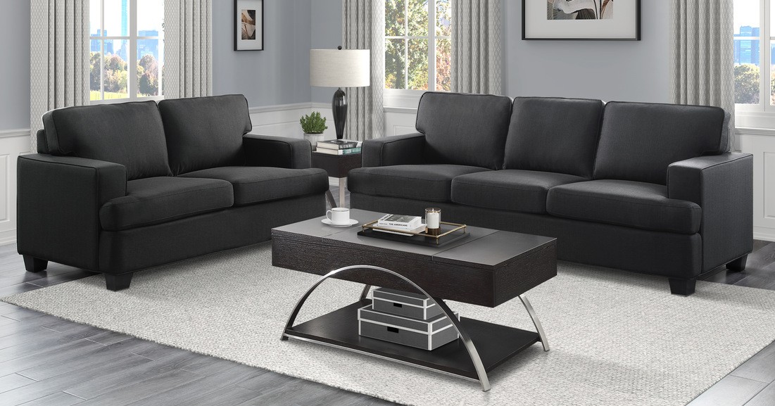 Homelegance 9327BK-SL 2 pc Elmont black textured fabric sofa and love seat set. This set includes the Sofa and Love seat with squared arms. Sofa measures 84″ x 34.5″ x 35″ H. Love seat measures 62″ x 34.5″ x 35″ H. Some assembly required.