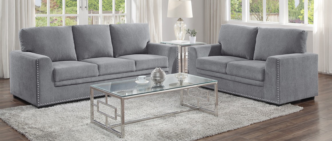 Source: Homelegance 9468DG-2PC 2 pc Morelia gray chenille fabric sofa and love seat set nail head trim