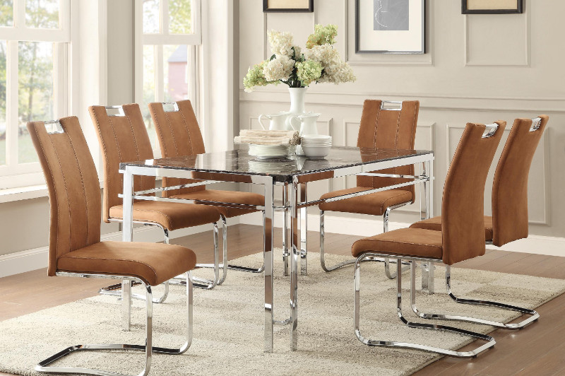 Homelegance HE-5178-60-BRS-7PC 7 pc Watt faux marble top chrome accents dining table set camel brown chairs