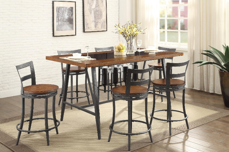 7 pc Selbyville gunmetal gray black glass insert counter height dining table set. Table features a black glass insert with bottle and wine rack hangers underneath the top. Table measures 36″ x 69″ x 36″ H. Chairs measure 16.5″ Dia. x 35.5″H. Some assembly required.
