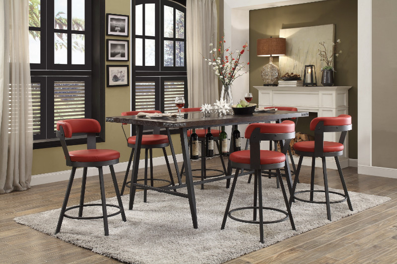 7 pc Appert gray metal glass insert counter height dining table set red chairs. Table features a black glass insert with bottle and wine rack hangers underneath the top. Table measures 36″ x 69″ x 36″ H. Chairs measure 22″ x 16.5″ x 39.5″H. Some assembly required.