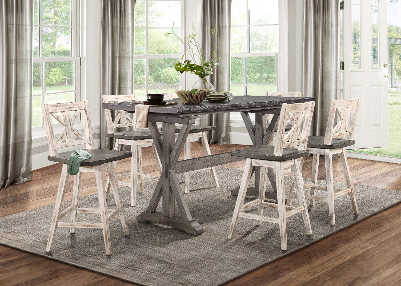 7 pc Gracie oaks marlon amsonia grey finish wood counter height dining table set white chairs. This set includes the table, 6 – side chairs with swivel wood seats. Table measures 30″ x 72″ x 36″ H. Side chairs measure 17.5″ x 17.5″ x 37.5″ H. Additional chairs also available separately. Some assembly required.