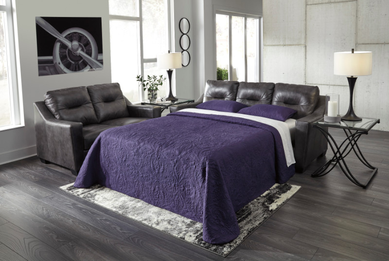 Kensbridge collection charcoal colored leather match upholstered queen sleeper sofa with squared arms. Sleeper sofa includes the Sofa with queen sleeper pull out with mattress included. Measures 84″ x 39″ x 39″ H. Some assembly may be required.