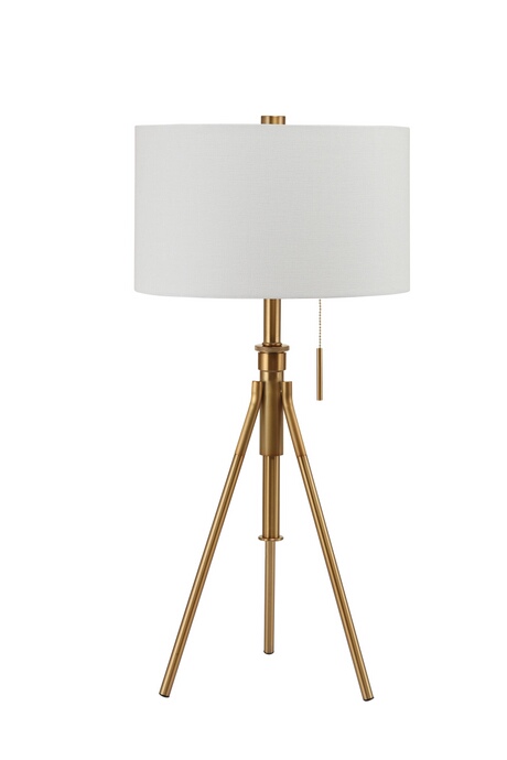 Gold finish metal tripod style table lamp with barrel lamp shade. Measures 15″ x 15″ x 32″-37″ H. Some assembly required.