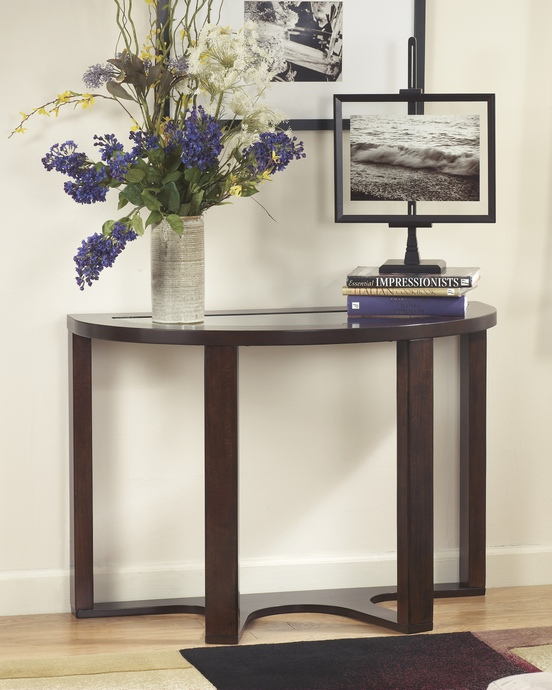 Marion collection dark brown finish wood and glass top sofa table. This includes the sofa table only with dark brown wood and glass top inserts. Sofa table measures 40″ x 18″ x 28″ H. Optional coffee table and end table available separately. Some assembly required