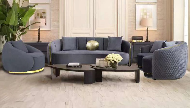 Mc Ferran SF338 2 pc Christy grey fabric sofa and love seat with gold trim accents diamond pattern back. Sofa measures 92″ x 43″ x 31″ H. Love seat measures 73″ x 43″ x 31″. Chair available separately at additional cost and chair measures 39″ x 43″ x 31″. Some assembly required.