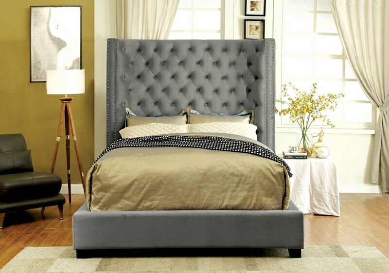 Mirabelle collection gray fabric upholstered and tufted tall queen headboard bed frame set. Measures 90″ x 69 1/2″ x 71 1/2″ H. Also available in Cal king and Eastern King. Some assembly required.
