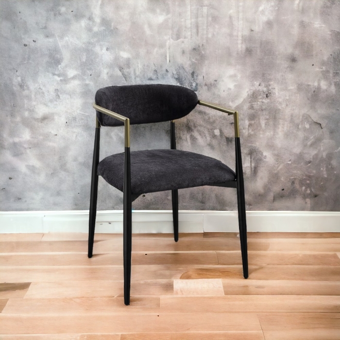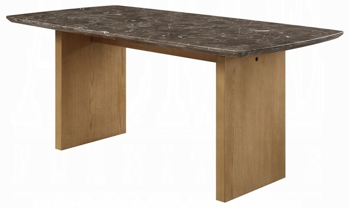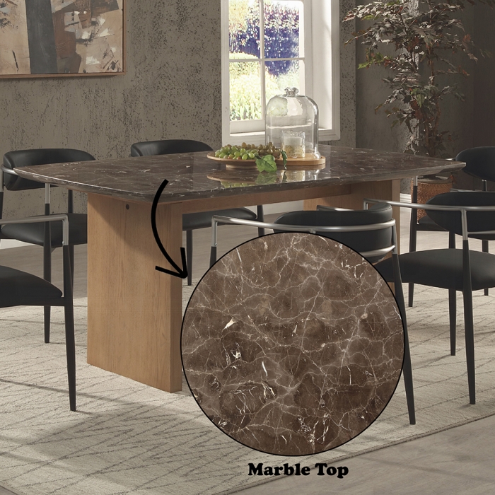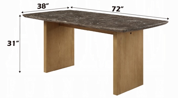 Acme DN03465-7PC-BK 7 pc Jaramillo natural finish wood base marble top modern dining table set gold accent trim. This set includes the table with natural wood finish base and marble top , 6 – side chairs with black fabric gold trim arms. Table measures 38″ x 72″ x 31″ H. Side chairs measure 22″ x 23.3″ x 30.5″ H to the back. Some assembly required.
