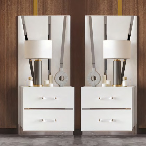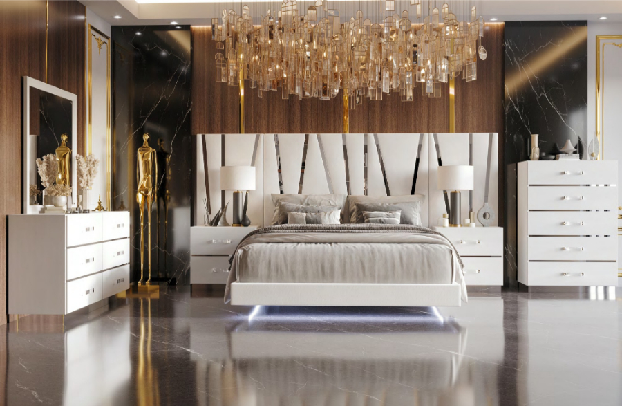 Source: Europa 00-1840-7PC 7-Pc Queen Bed Set with White Finish Wood Faux Leather & Silver Accents Modern Design Includes Bed Nightstands Dresser Mirror Underbed Lighting