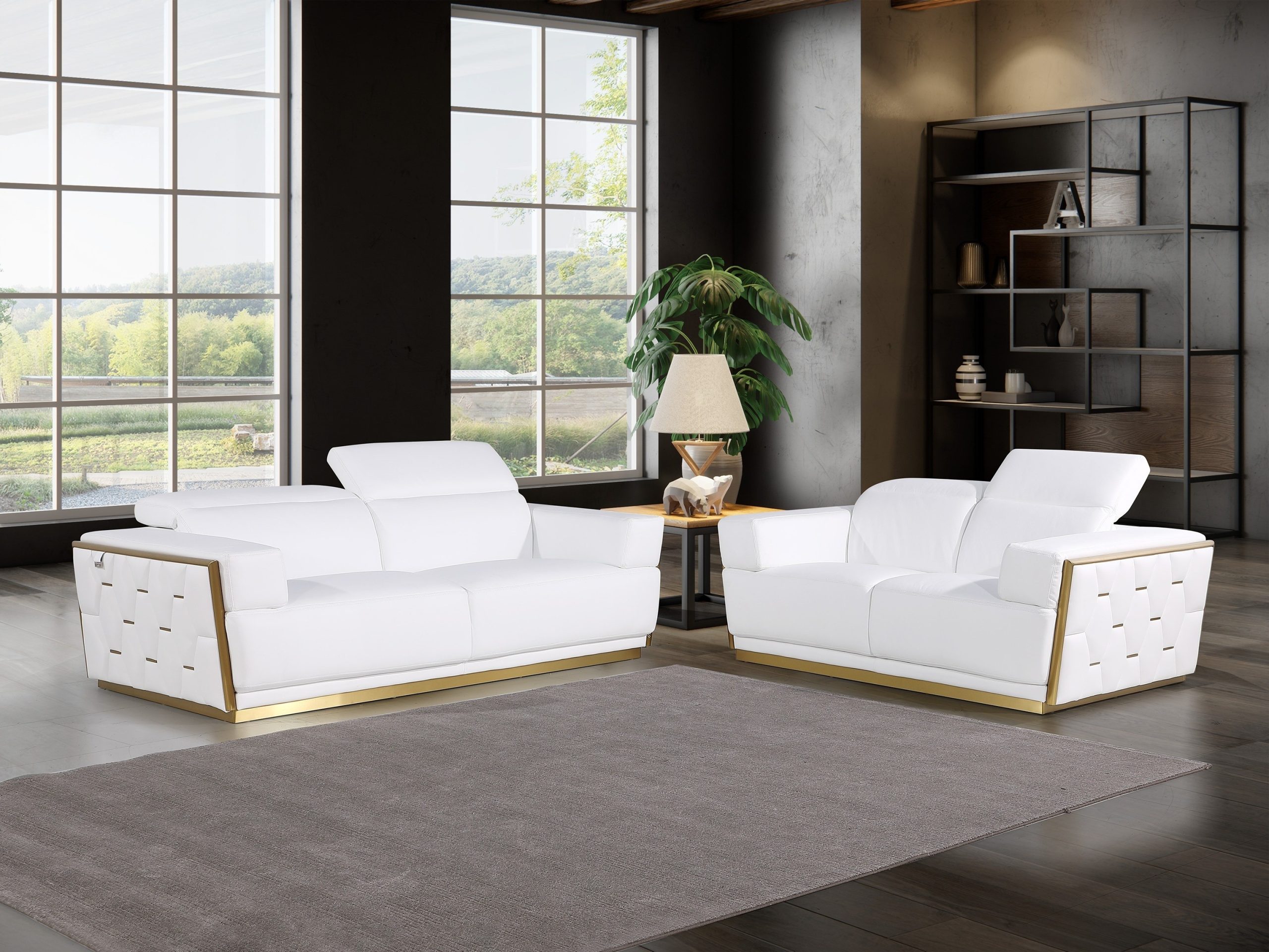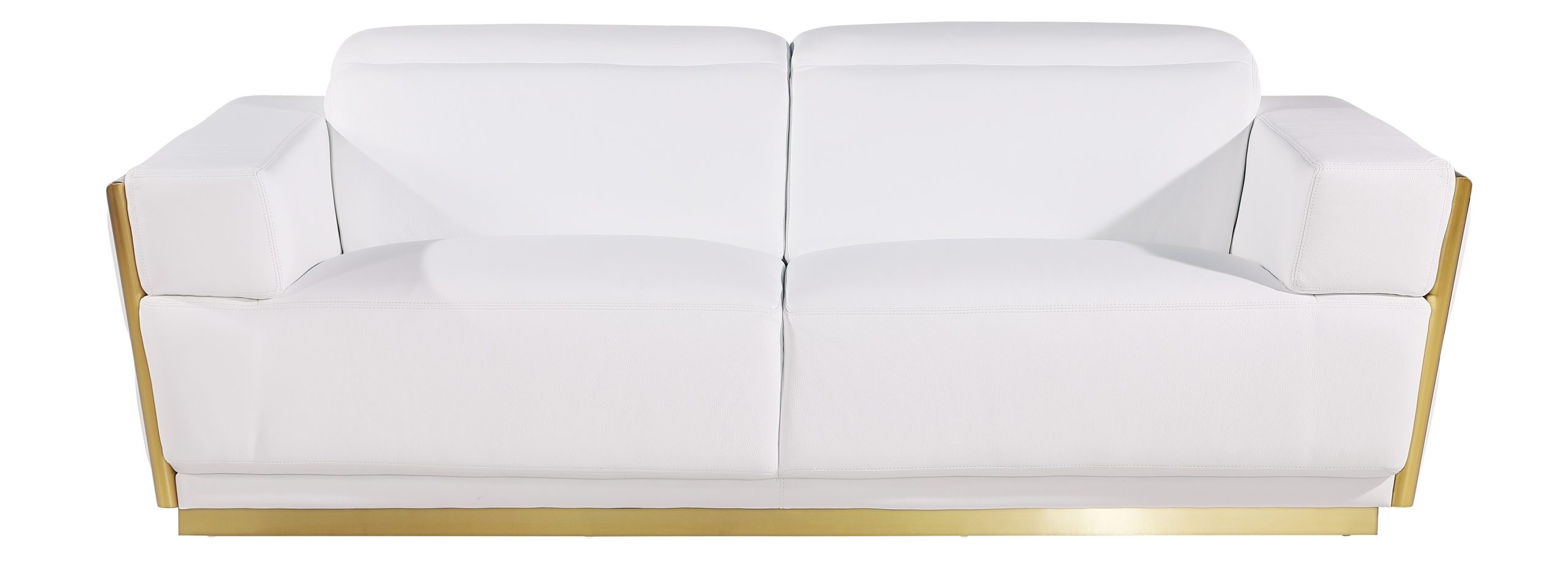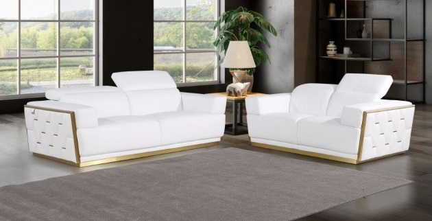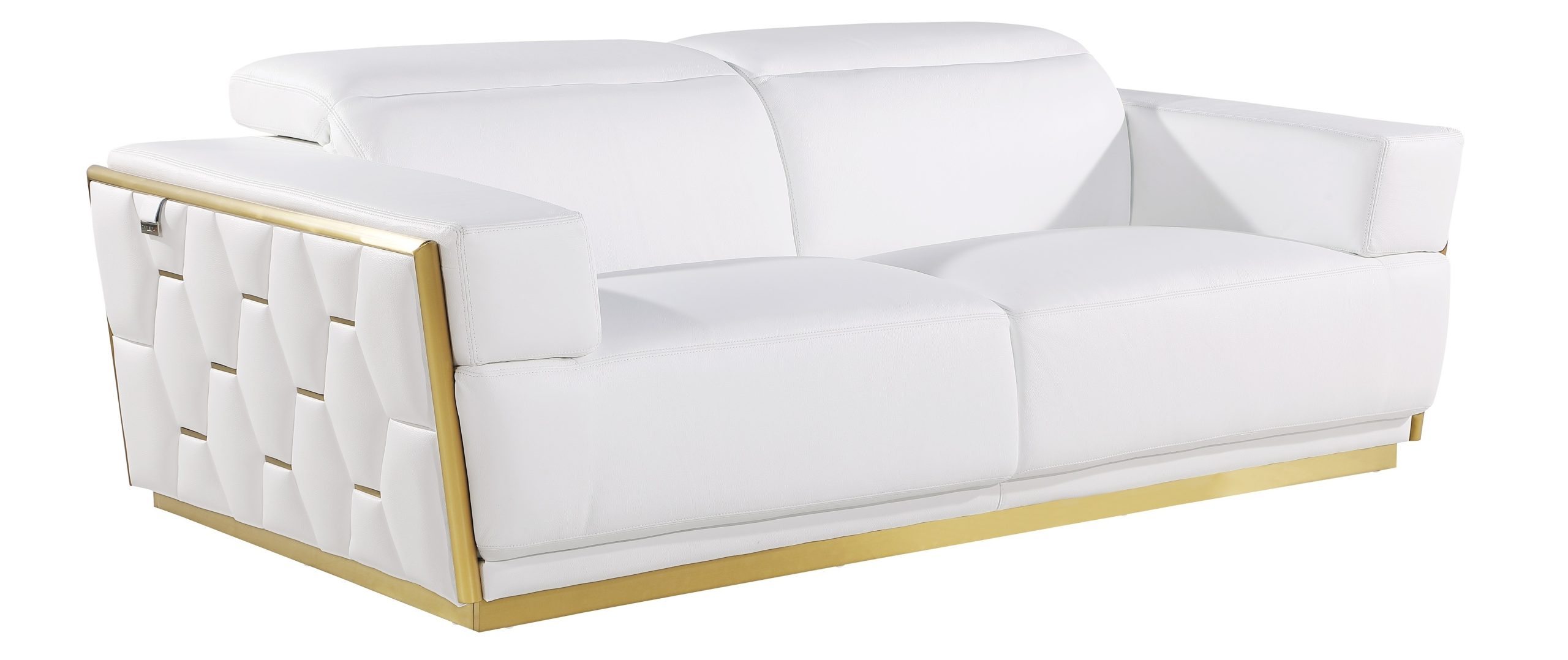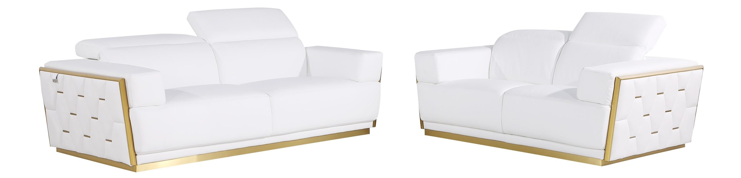 Global United 1111WHT-2PC 2 pc Modern style white Italian leather sofa and love seat set gold metal accents adjustable headrests. This set includes the Sofa and love seat with Italian leather upholstery, gold metal accents and Adjustable headrests. Sofa measures 89″ x 43″ x 30″ H. Love seat measures 70″ x 43″ x 30″ H. Chair also available separately at additional cost and measures 47″ x 43″ x 30″ H. Some assembly may be required.