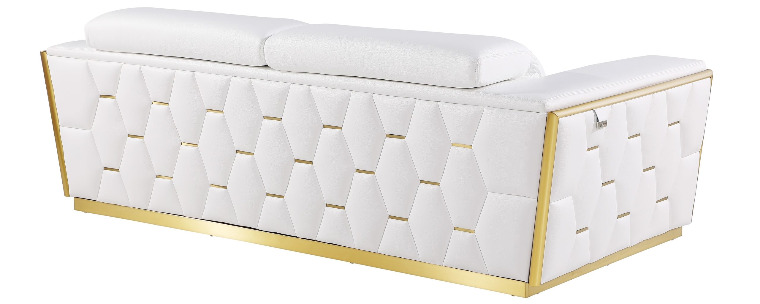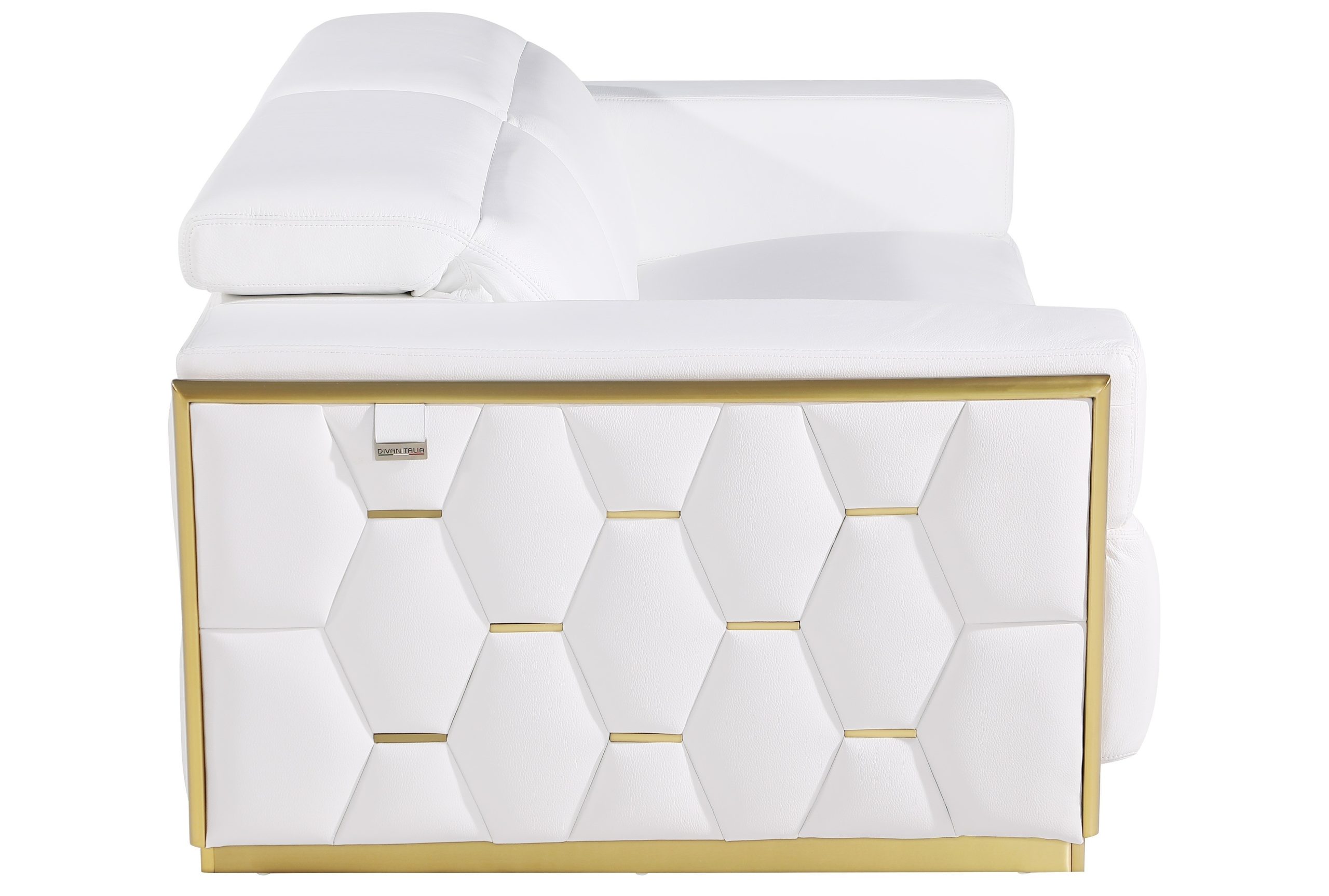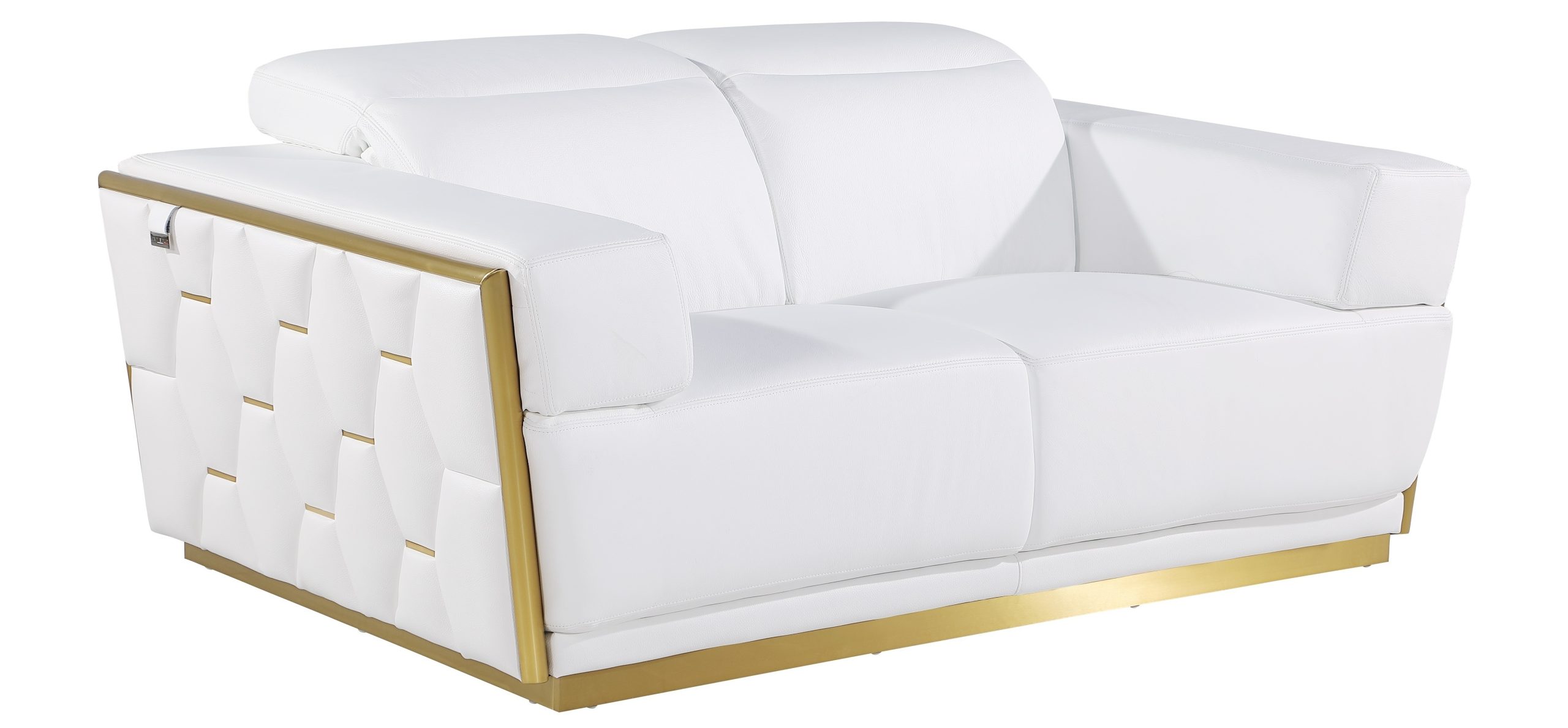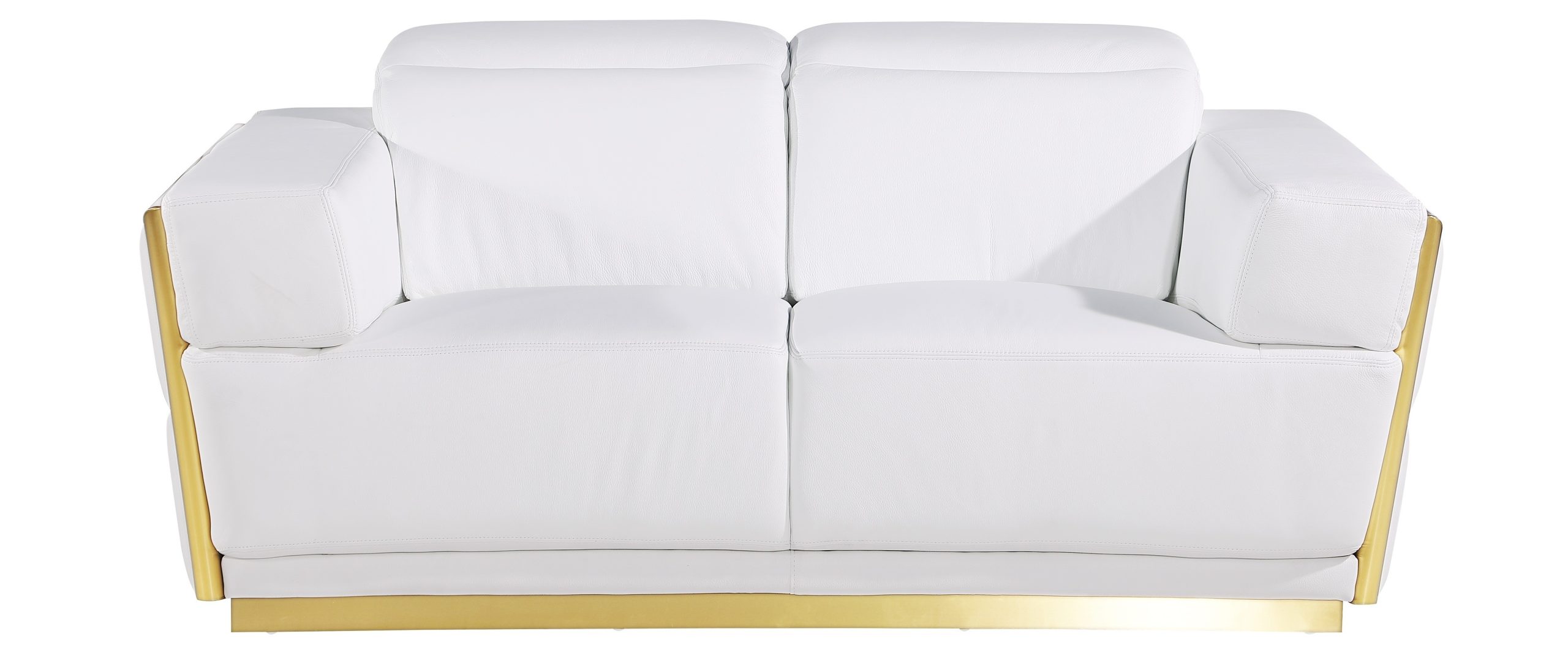 Global United 1111WHT-2PC 2 pc Modern style white Italian leather sofa and love seat set gold metal accents adjustable headrests. This set includes the Sofa and love seat with Italian leather upholstery, gold metal accents and Adjustable headrests. Sofa measures 89″ x 43″ x 30″ H. Love seat measures 70″ x 43″ x 30″ H. Chair also available separately at additional cost and measures 47″ x 43″ x 30″ H. Some assembly may be required.