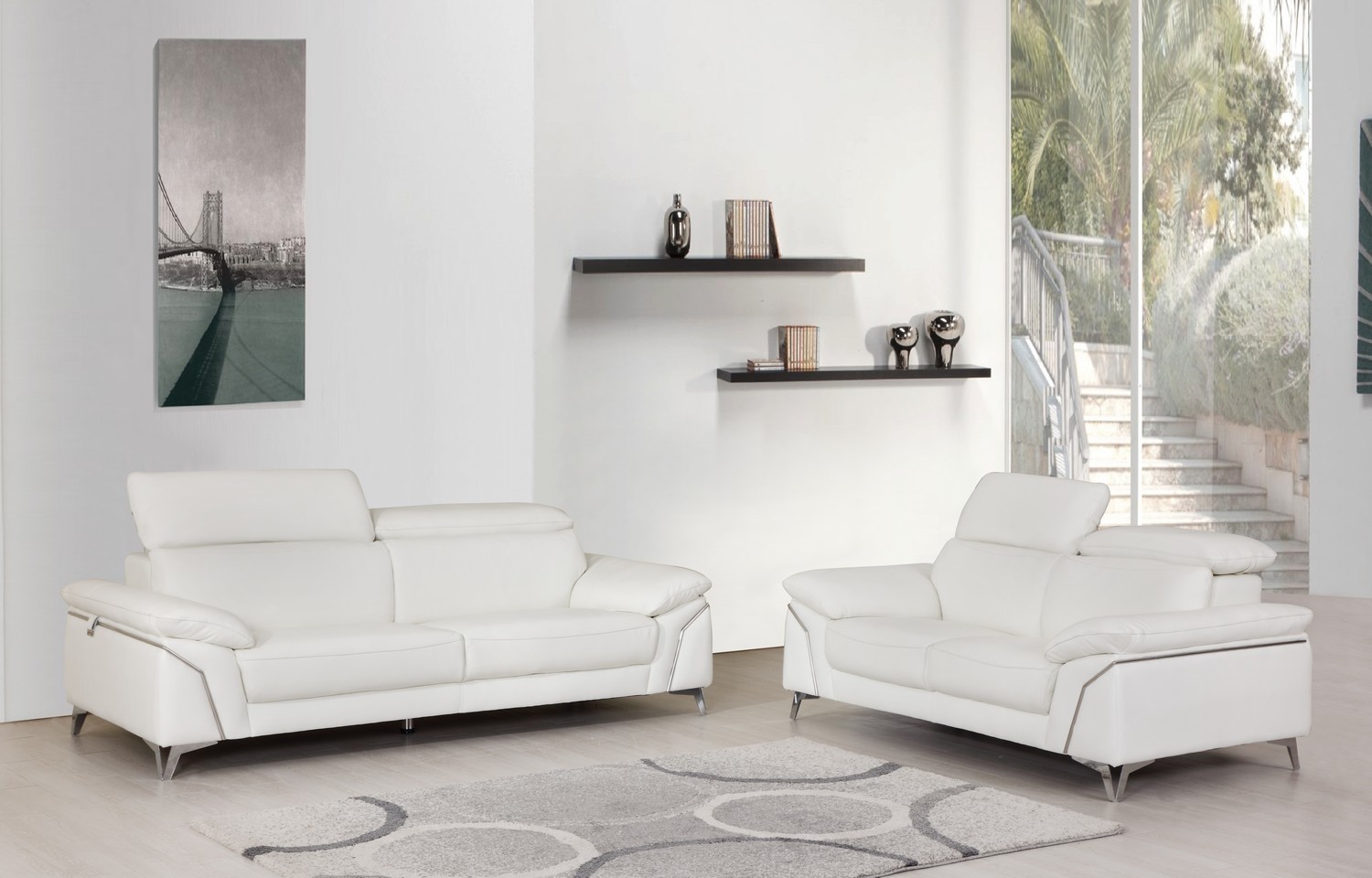 Global United 727WH-2PC 2 pc Orren ellis luigi divanitalia white italian leather sofa and love seat set. Features Italian leather upholstery and stainless steel accents, and adjustable headrests. Sofa measures 88″x 41″ x 31″ – 39″ H. Love seat measures 72″ x 43″ x 31″ – 39″ H. Some assembly required.