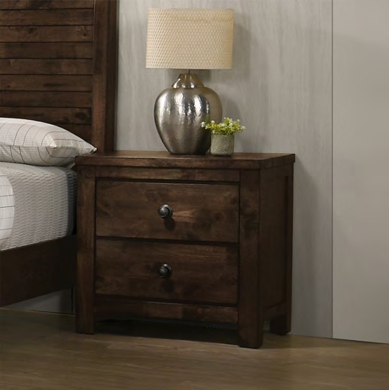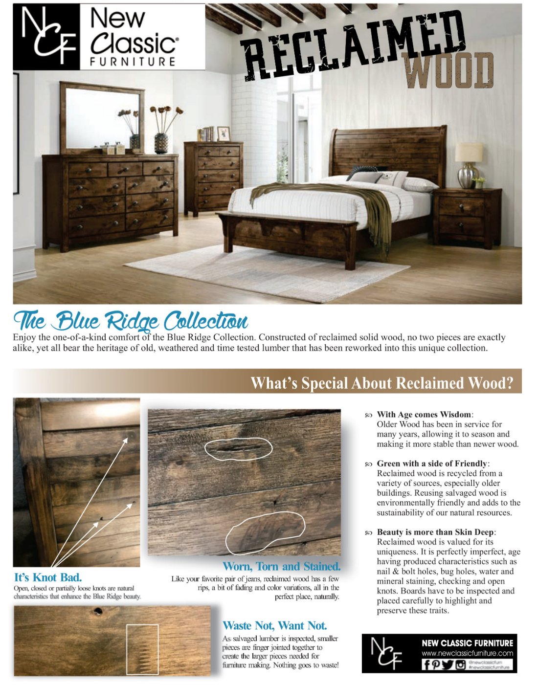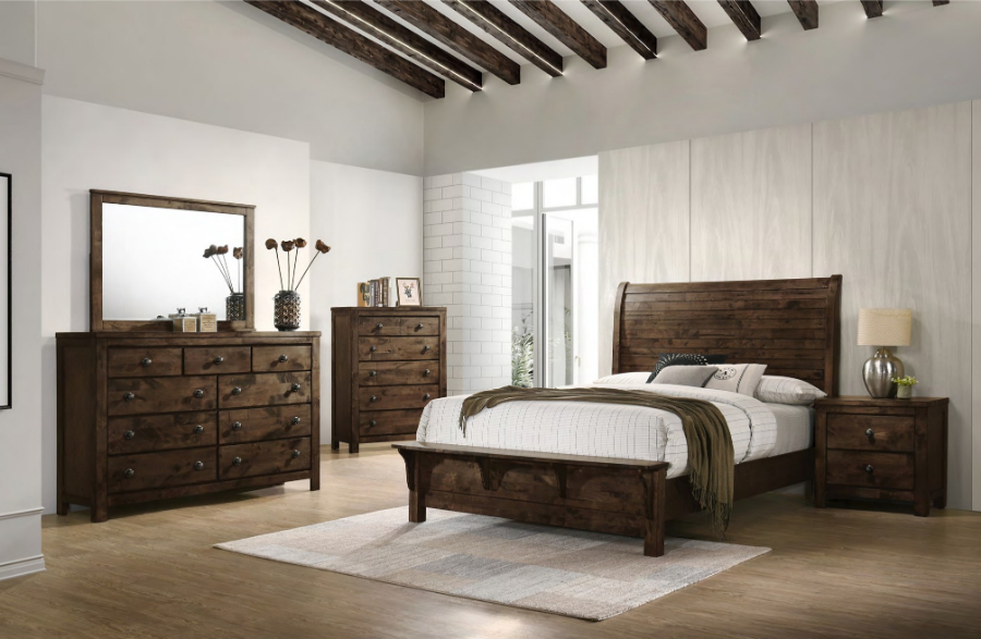 00-1334-4PC 4 pc Blue ridge rustic brown grey finish wood classic style sloped back sleigh headboard queen bed set. This set includes the bed, Nightstand, Dresser and Mirror. Bed Measures 65″ x 109″ x 57.2″ H. Nightstand measures 16.38″ x 26.38″ x 26.25″ H. Dresser measures 63″ x 17.75″ x 41.73″ H. Mirror measures 46″ x 1.5″ x 33.5″. Chest also available separately. Also available in Cal King and Eastern king. Some assembly required.