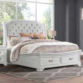 00-493W-4PC 4 pc Lyndhurst vintage white finish wood country sleigh fabric upholstered headboard style queen bed set footboard drawers. Features bed with fabric tufted headboard , and footboard storage drawers. This set includes the bed, nightstand, Dresser and Mirror. Bed Measures 67″ x 91.2″ x 75″ H. Nightstand measures 17″ x 26.5″ x 28″ H. Dresser measures 66″ x 18″ x 40″ H. Mirror measures 40″ x 3.4″ x 44″. Chest also available separately. Also available in Cal King and Eastern king. Some assembly required.