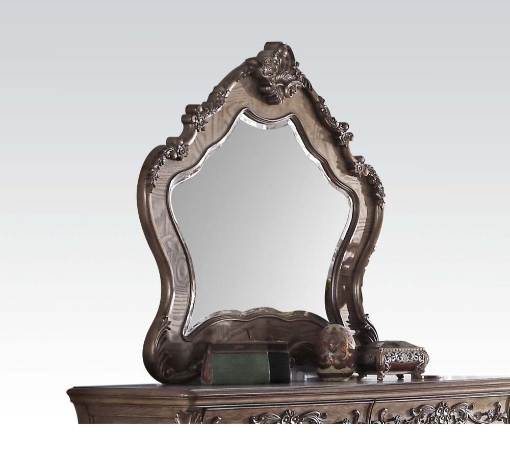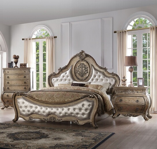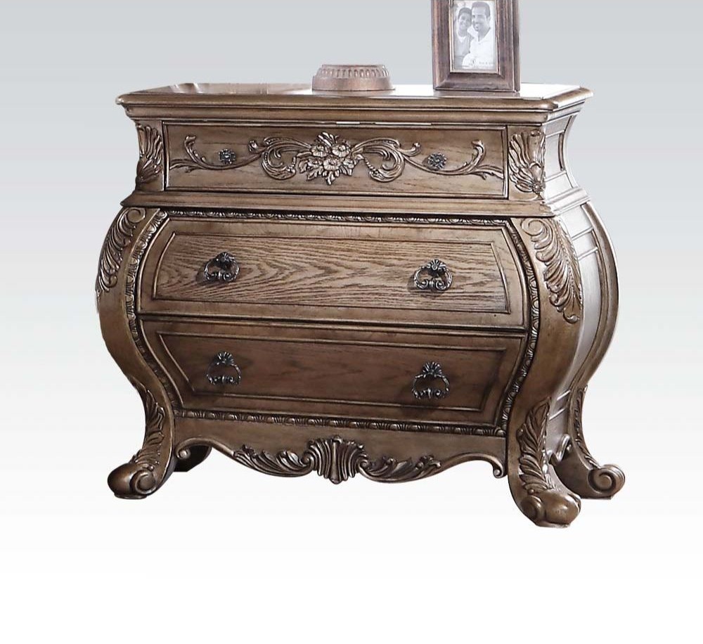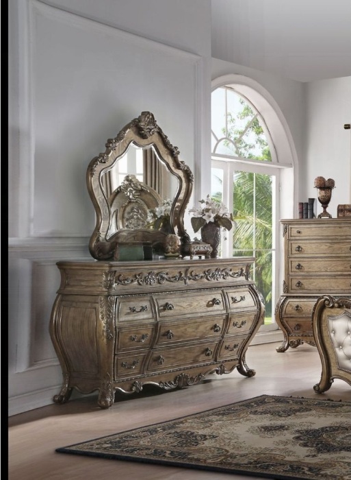 Acme 26310Q 4 pc Ragenardus vintage oak finish wood queen bedroom set decorative carvings tufted accents. This set includes the Queen bed set, one nightstand, Dresser, Mirror. Queen bed features decorative carvings, tufted headboard and footboard. Queen bed measures 89″ x 73″ x 76″ H. Nightstand measures 38″ x 20″ x 34″ H. Dresser measures 73″ x 23″ x 41″ H. Mirror measures 46″ x 48″ H. Chest available separately at additional cost and measures 42″ x 21″ x 57″ H. Some assembly required. Cal king and Eastern king also available at additional cost.