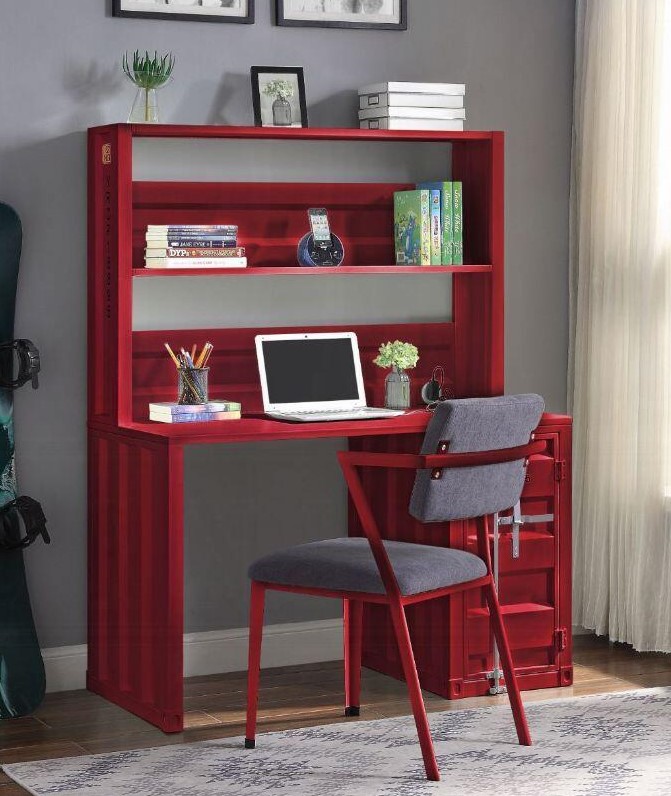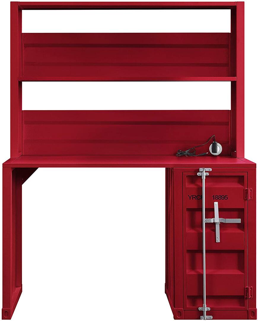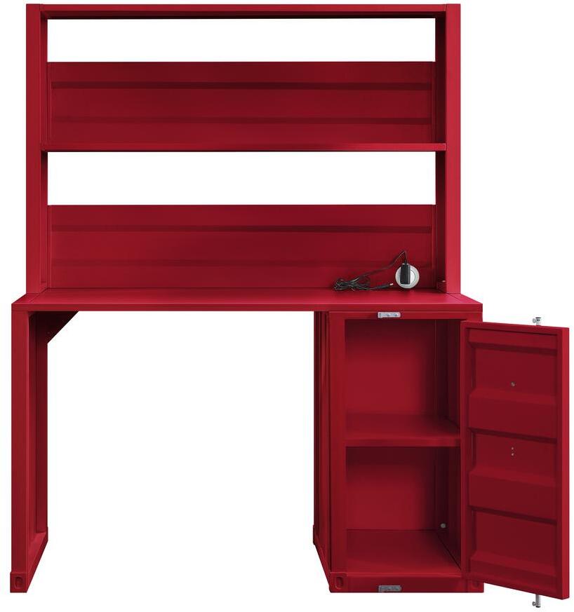 Acme 37917 2 pc Williston Forge cargo container style red finish metal kids student desk and hutch set. Desk measures 47″ x 24″ x 60″ H. Some assembly required.