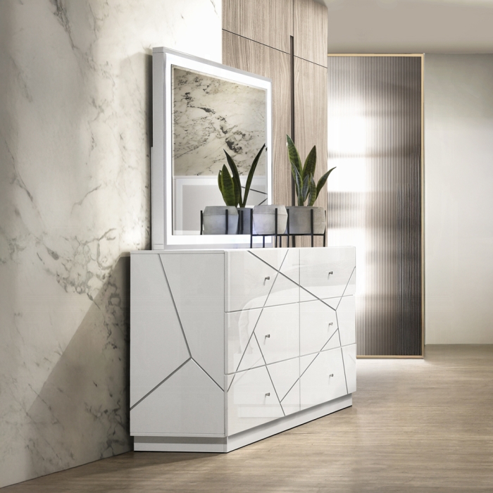 Acme BD05882-4PC Esther white and silver high gloss finish wood modern queen bedroom set LED accents. This set includes the Bed, Nightstand , dresser and mirror. Bed measures 84″ x 66″ x 57″ H. Nightstand measures 23″ x 16″ x 23″ H. Dresser measures 62″ x 18″ X 35″ H. Mirror measures 46″ x 2″ x 37″ H. Chest available separately at additional cost and measures 31″ x 18″ x 50″ H. Additional pieces also available separately at additional cost. Eastern king also available. Some assembly required.