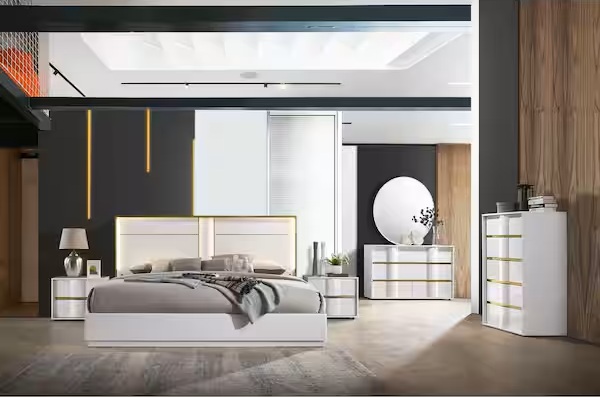 Best Master Havana 4 pc Orren ellis kumail Havana white high gloss finish wood with gold trim modern style queen bed set. Queen bed set includes the Queen bed frame, one nightstand, Dresser and mirror. Queen bed measures 84″ x 68″ x 48″ H. Nightstand measures 22.5″ x 17″ x 19″ H, Dresser measures 48″ x 17″ x 32″ H. Mirror measures 42″ x 1″ x 36″ H. Some assembly required for the bed frame set and mirror. Optional chest available separately. Also available in Cal king and Eastern king size at additional cost.