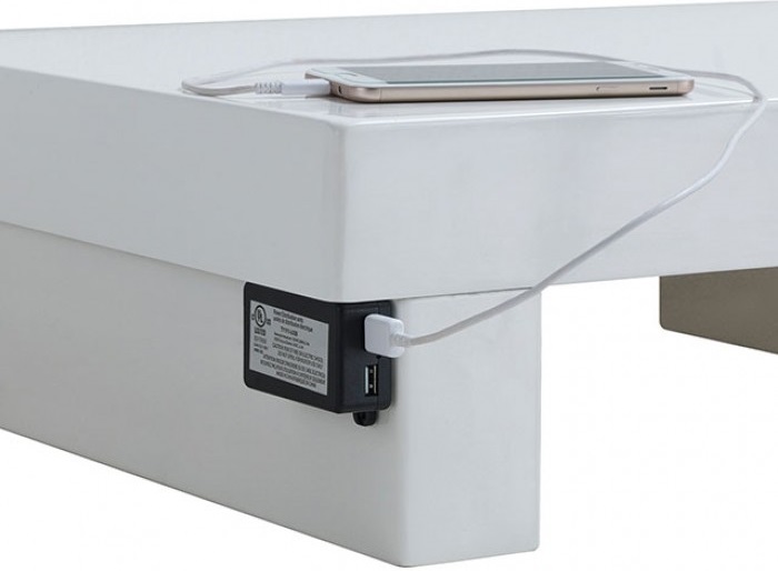 CM7550-4PC 4 pc Christie white high gloss finish wood modern design platform padded headboard Queen bedroom set USB. This set includes the Queen bed, 1 – nightstand with USB plugs, dresser, mirror. Features a silver accents with USB charger nightstand. Queen bed measures 94″ x 77″ x 27″ H. Nightstand measures 23″ W x 17.5″ D x 7″ H. Dresser measures 57″ W x 17.5″ D x 32″ H. Mirror measures 28″ W x 42.5″ H x 1.5″. Chest available separately at additional cost and measures 31″ W x 17.5″ D x 51″ H. Some assembly required. Also available in Cal King, Eastern King at additional cost.