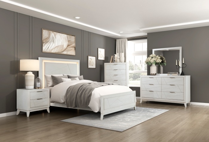 Homelegance 1355-4PC 4 pc Asteria antique white finish wood LED accent lighted headboard queen bedroom set. This set includes the Queen Bed, Nightstand, Dresser, Mirror. Queen bed measures 64.5″ x 87″ x 60″ H. Nightstand measures 26.5″ x 18″ x 26.5″ H. Dresser measures 62″ x 18″ x 39.5″ H. Mirror measures 40″ x 1″ x 38″ H. Chest available separately at additional cost and measures 40″ x 18″ x 56″ H. Also available in Cal king and Eastern King. Some assembly required.