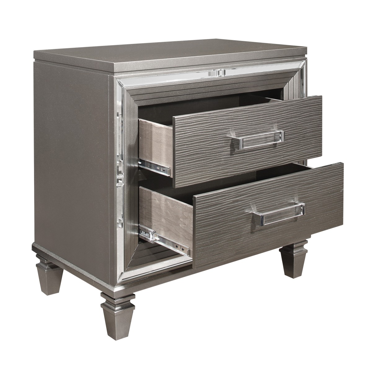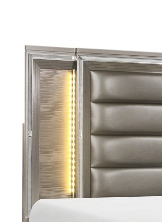 Homelegance 1616-4PC 4 pc Tamsin silver gray metallic finish wood mirrored trim queen bedroom set with led trim . This set includes the Bed, Nightstand, Dresser, Mirror. Bed measures 63″ x 85.5″ x 68″ H. Nightstand measures 30″ x 17.5″ x 30″ H. Dresser measures 66″ x 18″ x 41″ H. Mirror measures 50″ x 2.75″ x 38.75″ H. Chest available separately at additional cost and measures 38″ x 17.5″ x 54.25″ H. Also available in Cal King and Eastern King. Some assembly required.