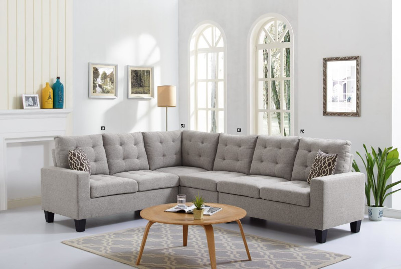 4 pc collette collection light gray polyfiber faux linen fabric upholstered sectional sofa. This set includes the right arm loveseat corner wedge and left arm loveseat and armless chair. Sectional as shown measures 84″ x 107″ x 32″ D X 35″ H. Armless chairs measure 23″ x 32″ x 35″ H. Some assembly required.