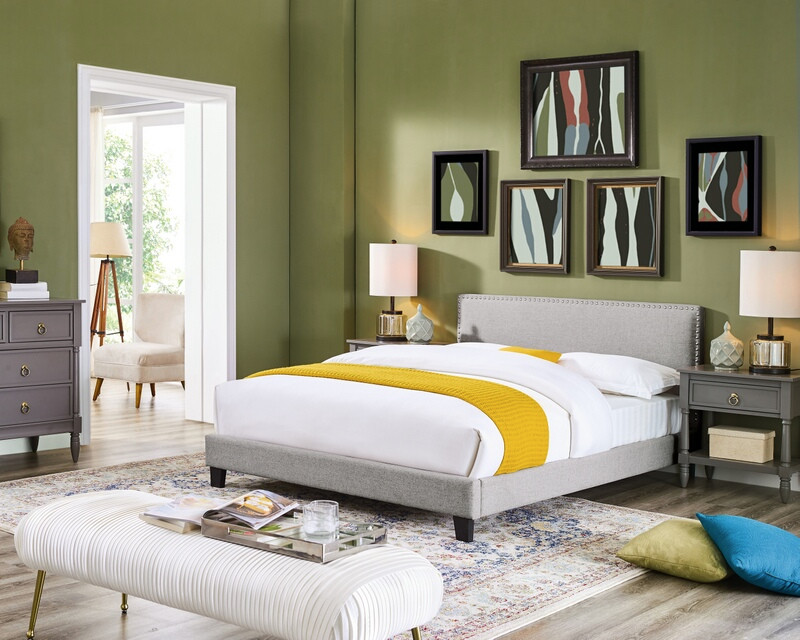 Source: OAH D3001 Sterling light gray linen like fabric queen low-profile bed frame set