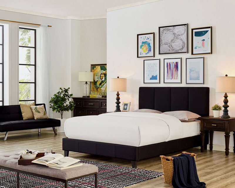 Source: OAH D3007 Sterling black faux leather queen low-profile bed frame set