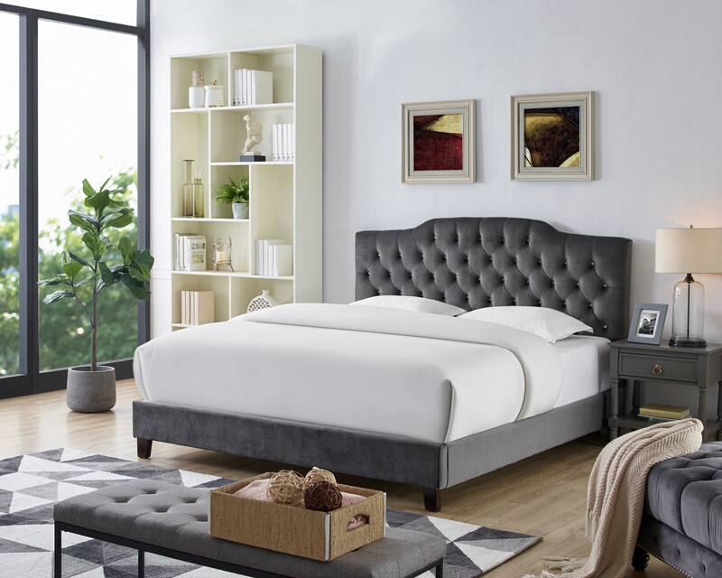 Source: OAH D3009 Sterling gray velvet like fabric queen low-profile bed frame set