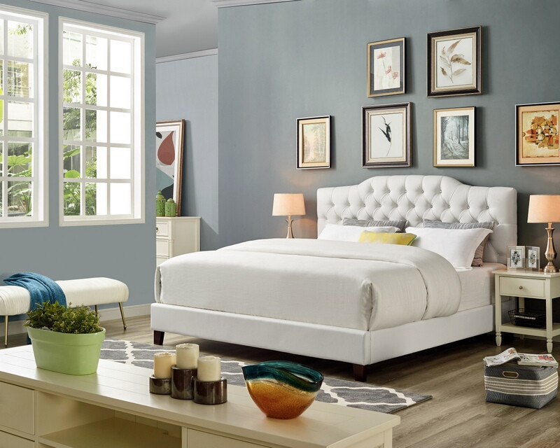 Source: OAH D3011 Sterling white faux leather queen low-profile bed frame set