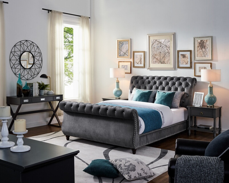 Source: OAH D3021 Sterling gray velvet like fabric queen sleigh bed frame set