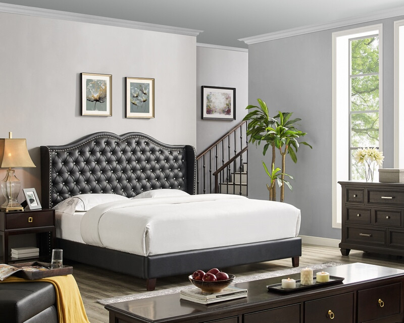 OAH D3026 Sterling black faux leather queen tufted bed frame set