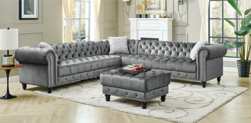 Source: OAH D6075-3 6 pc Chesterfield gray velvet like fabric rolled arm sectional set nail head trim
