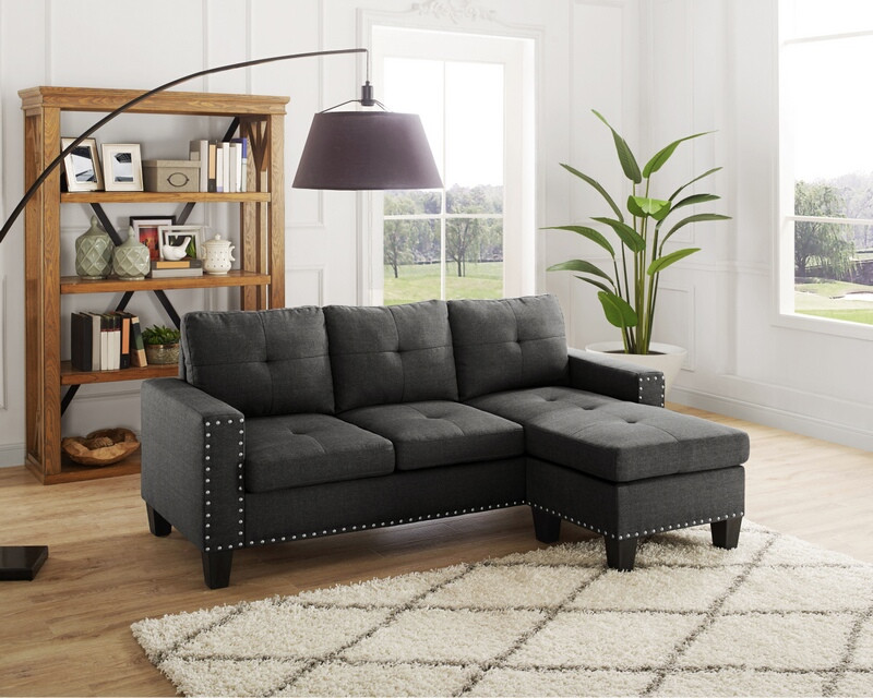 Source: OAH D6101 2 pc Blair steel gray linen like fabric nail head trim reversible sectional sofa