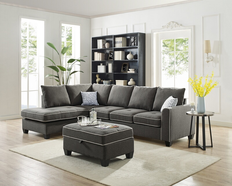 OAH D6144 3 pc Revive steel gray linen like fabric sectional sofa reversible chaise