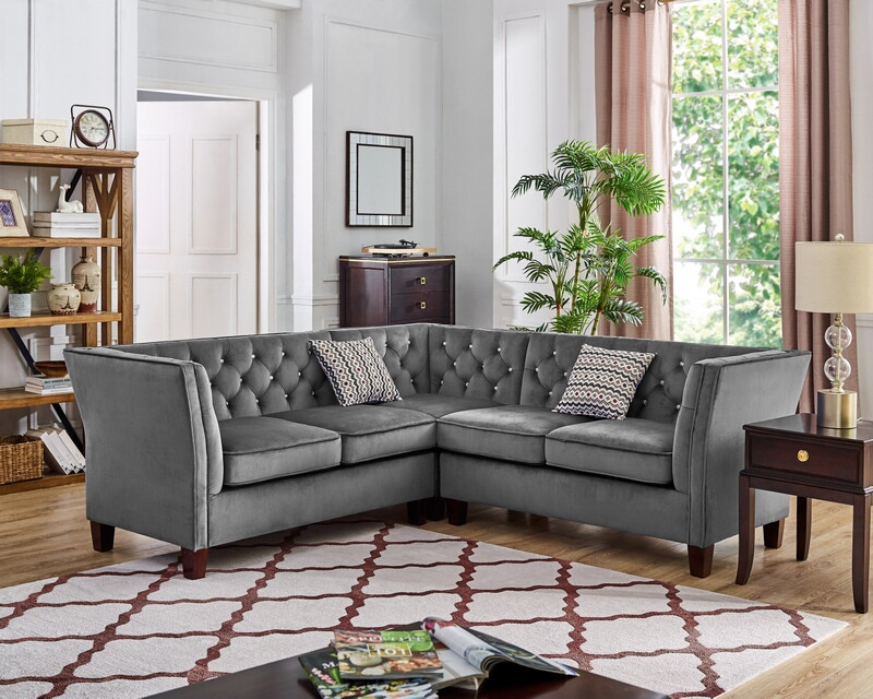 3 pc Trane gray velvet like fabric sectional sofa flared arms. This set includes the 3 pc sectional set , LAF love seat, Corner wedge, RAF love seat. Sectional as shown measures 89″ x 89″ x 33 x 33″ H. Ready to assemble. Requires assembly.